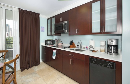 – Resort kitchen with upgraded appliances including full-size refrigerator with ice maker, 4-burner stovetop, microwave, convection toaster over, dishwasher, coffeemaker, rice cooker (NO full-size oven)