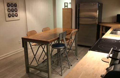 With a separate and private entrance at the side, access is easy with your own code, no keys required. The spacious kitchen is fully equipped with IKEA cabinets, butcher block counter tops, stainless steel appliances, as well as a coffee maker & grinder, microwave, toaster oven, pots, pans, dishes...