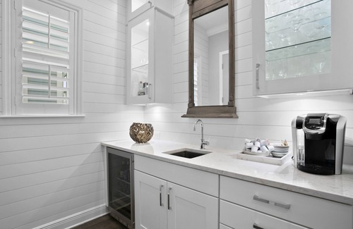 This 3 bedroom townhouse is absolutely stunning. This home was built for fun and relaxation. The living space is located on the second floor and all 3 bedrooms with 2 full baths are located on the third floor. Exquisitely decorated (think Restoration Hardware) the main living area features a large open living area, powder bath, dining table that seats 10 and an open kitchen with a huge island, high end appliances and a cocktail bar as well. There is also an office space with desk for those needing to work remotely. You will also find tons of windows, high ceilings, your own elevator and a private balcony facing the beach. The third floor features two guest bedrooms with queen beds and a shared full bath and a separate laundry room with sink. Also on the third floor is a serene master bedroom with beautifully appointed master bath and full walk in closet. There is also a small private desk in this area for "working from home" as well. Oh, and another balcony with views of the beach. On the ground floor is a two car garage and private back lanai area surrounded with lush tropical flora, gas grill and TV for dining al-fresco.