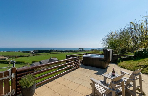 Its hillside location allows for spectacular views of countryside and sea from this superior cabin which is just a 10-minute walk to the nearest sandy beach and a mile from Abersoch. The Llyn Coastal Path passes ½ mile away and guests can bring a dog. Abersoch is known for its boating events and is home to numerous shops and eateries. Explore the beautiful Llyn Peninsula with its quiet lanes, scores of beaches, pretty villages and scenic walks or drive east to visit the Ffestiniog Railway or Portmeirion. Or simply relax in the private hot tub and take in the scenery!