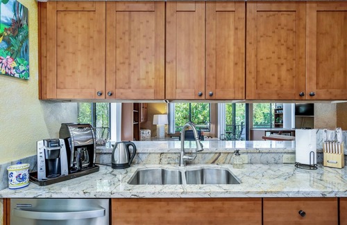 Wailea Grand Champions #135 is a 1 bedroom 2 bath unit in a lovely complex - brand new to the rental market with a fantastic introductory rate! The unit has a fully equipped kitchen, washer and dryer, room air conditioning in both the bedroom and the living room as well as ceiling fans throughout. The washer and dryer are conveniently housed in the lanai closet as a space-saving measure. The bedroom of Grand Champions #135 has a king bed and an ensuite bathroom that includes a shower with a bench. The convenient second bathroom provides a shower/tub combo. There is a sofa sleeper in the living room to provide a separate sleeping space for the second guest. There is a television and a/c in both the living room and bedroom, along with free WIFI. This property has a maximum occupancy of 4 people.