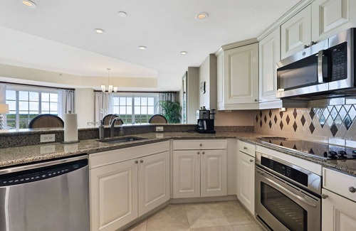 Relax and unwind on the expansive balcony, complete with a table and chairs, perfect for enjoying your morning coffee or watching the sunset over the horizon. From this vantage point, behold the awe-inspiring panoramic views of the themed-parks and the space coast, creating a truly magical backdrop to your stay. Indulge your culinary desires in the fully equipped kitchen, complete with modern appliances and ample counter space.