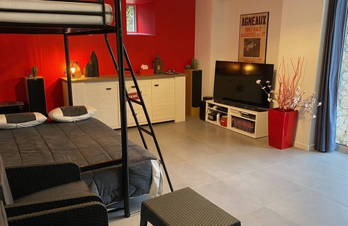 It is composed on the ground floor of a dormitory opening to accommodate 5 people (sink in the rooms), 1 bedroom bed 140x200 with its bathroom, 1 bedroom bed 160x200 with shower, sink and toilet in the room with independent door.