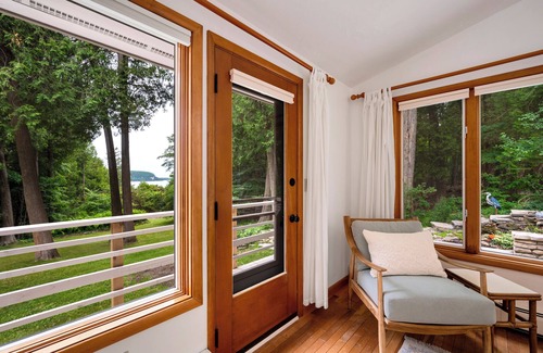 About this space – We are so excited to open our family home to you! (Have I mentioned the view from the deck??) This private house is perfect for families or small groups looking to enjoy the best of the Door Peninsula. The cozy, yet generously sized wood paneled mid-century home can sleep up to 5 people. Our stunning backyard retreat includes a two-level deck and an outdoor grill area. We have used local, Door County art to decorate our house, including our father’s work.