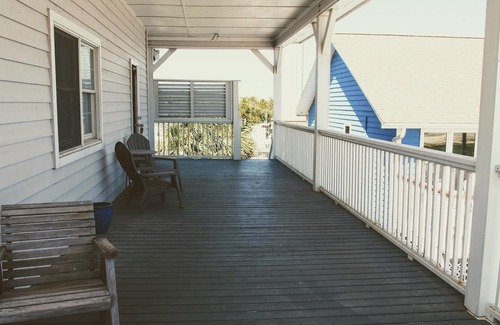 * SITTING PORCH: Deep wrap-around veranda with picnic table, perfect for outdoor dining and watching the seagulls.