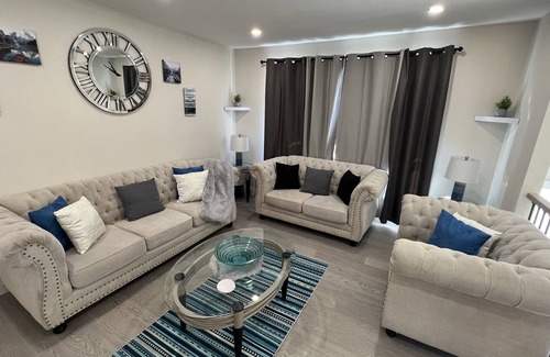 Welcome to our newly renovated, luxurious home located in a prime area of Kitchener! Our modern decor and unique furnishings will make you feel right at home. The main floor features a living and dining area with access to a walkout deck, fire pit, and hot tub, which can accommodate up to 6 people.