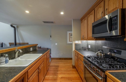 Located in Dollar Point, the Great Escape vacation rental has been extensively remodeled features 4 bedrooms/2 baths and a detached two car garage. The kitchen, living room and dining room are open to one another for easy conversations. The living room offers tasteful furniture appointments, skylights for a bright feel, gas fireplace, and flat screen TV with DVD. The house contains alder doors and trim, new flooring, and all brand new furniture including mattresses. The front deck off the living room has a propane BBQ, patio furniture and hot tub.