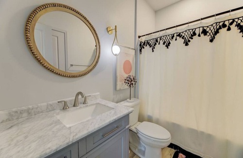 Bathroom 3 is a private full sized bathroom right off of bedroom 3. This bathroom has a shower/tub combo and is furnished with modern fixtures. There is a single vanity that allows your guests to put away all of their bathroom essentials during their stay. This bathroom comes stocked with hotel shampoo, conditioner and soaps during your stay.