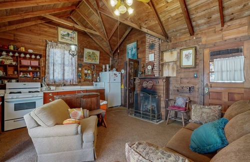 At The Cottage, rustic country charm meets modern comfort at this vacation rental with a cozy upstairs parlor, a spacious studio kitchen (no dishwasher), a living and dining area with cathedral ceilings, and a charming Dutch door. (The fireplace is not operational.) The large, vintage bathroom boasts a ball and claw tub, a French shower, and an antique marble sink.