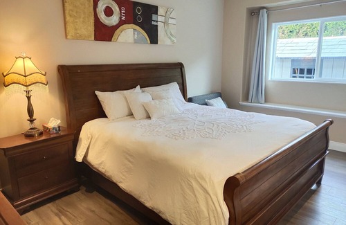 This completely ground level suite has its own private entry with 9 ft ceiling, 2 specious bedrooms, 1 full bathrooms and a large living area as well as a full kitchen. Each room is equipped with a king/queen sized bed with comfortable mattresses and luxury bedding sets, an additional sofa bed is provided in the largest bedroom, good size Sumsung smart TV is provided in living room. There is no living area directly above this suite so you can enjoy quiet goodnight sleep in the comfortable bed. Lovely private covered backyard patio is perfect for a staycation and relaxation.