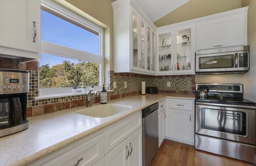 Upon arrival, guests are met with an inviting storybook two level cottage. The 1st level is where the fun begins with the game space located in the garage area: a Ping Pong Table, Air Hockey, and a Foosball Table, along with video games make for a fun and inviting space. Enjoy a beverage or two at the bar area and watch your favorite sports team on the large screen television. Open the side garage door and find a hidden treasure, a relaxing hot tub with twinkling lights, follow the lighted pathway to the ring of fire surrounded with outdoor seating. A half bath and laundry room are located inside the house just off the game space.