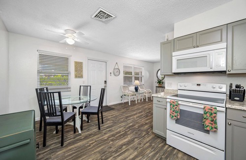 Welcome to Gulf Breeze Getaway, a charming and updated cottage on Indian Rocks Beach.⛱️ This delightful raised unit greets you with a lovely deck featuring comfortable seating. Step inside to an inviting open floor plan encompassing the living and dining areas—perfect for cooking, dining, and relaxation. The cottage offers two cozy bedrooms, each with a queen-size bed, and a hall bathroom with a shower/tub combo. Both bedrooms include a smart TV for your entertainment.
