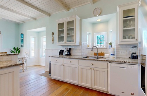 On the second floor, you'll find even more space to entertain in the second living area, complete with a sectional sofa, armchair, and 50” TV. Take your morning coffee out onto the balcony to enjoy the ocean breeze. Detailed with gleaming granite countertops and a full suite of appliances, the well-appointed kitchen offers plenty of space to prep meals and comes equipped with dishes, a regular drip coffee maker, basic pots, pans and utensils. The double sink is surrounded by a wall of windows. Sit down to dine at the large table with seating for eight, and four stools at the breakfast bar. The laundry room sits off of the kitchen area. Make use of the full-size washer, dryer, sink, iron and ironing board during your stay. High ceilings soar in the second-floor master suite (BR2), which features a King bed, 50” TV, luggage rack, nightstands, chest for your beach attire, desk for working from home, private balcony, and a private bathroom with a walk-in shower with glass door and soaking tub.