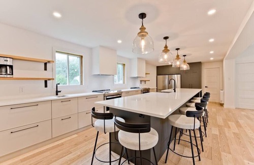 With two refrigerators, a pantry, two sinks, a walk-in pantry and a central island, this convivial space is perfect for sharing a breakfast, a snack, working or simply enjoying a drink while letting your guests express themselves culinary creativity!