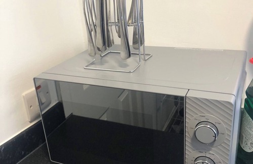 The kitchen has a fridge, a hob, a toaster, a kettle, a freezer and a microwave.