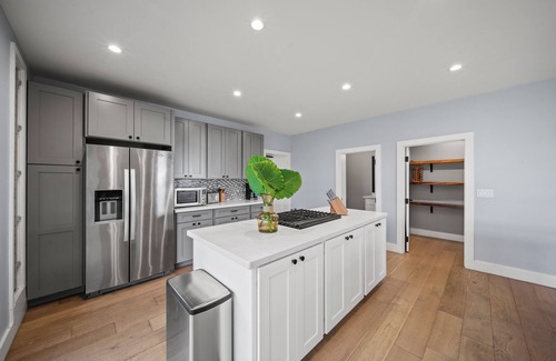 Step through modern double doors and into an open-concept home filled with light, tropical breezes, and thoughtful design. The fully equipped kitchen is a culinary dream with quartz countertops, custom gray cabinetry, stainless steel appliances, and a gas range. The oversized island invites gathering, while pendant lights and recessed fixtures provide a bright and airy workspace.