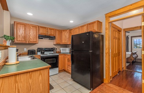 The laundry room is conveniently located in a closet off the kitchen. The guest bedroom features a king bed, flat-screen TV, and private full bath. The master bedroom offers a king bed, flat-screen TV, and its own private full bath with a jetted tub and shower combo. Please note both beds are tall beds.