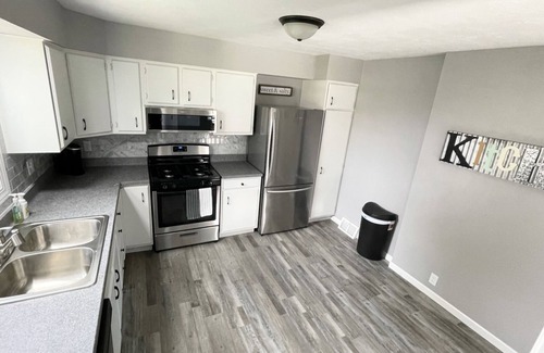 Stay in the heart of Oshkosh in our newly remodeled Aviation themed home, "The Hangar." This is a perfect getaway with a large upgraded modern kitchen and a large living space with foosball and board games. Open concept with a 65 inch smart tv in the living room! There are 2 bedrooms and 2 full bathrooms downstairs including a master suite with king size bed with master bath. Upstairs, there are 3 bedrooms each with queen beds, a full bathroom, and a kitchenette. All rooms have smart tv's in them! All new windows that let in great lighting, enjoy reading a book on the window seat on a nice afternoon. Large lawn yard for entertaining. Two car garage along with a driveway for plenty of parking. Walking distance to a coffee shop, restaurants, and beautiful South Park. Less than a mile away from Menominee Nation Arena and less than 3 miles from EAA.