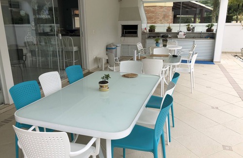 House with 420 m2 of built area, balcony, dining room, living room, home theater with fireplace, toilet, large and complete kitchen, pantry, laundry, large play area with barbecue, cooktop, pool with cascade, shower, bathroom exterior, 04 suites, 02 bedrooms, air conditioning in all rooms, cable tv, maid's room, garage for 4 cars and garden.