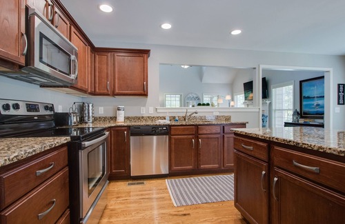 Spacious Retreat: Harbor Cottage boasts 3 bedrooms, a bonus area, and 3 baths, accommodating up to 9 guests. The master bedroom features a king bed and a full bath, while the second bedroom offers another king bed with a full bath, and the third bedroom provides a queen bed with a twin overfull with a full bath. The bonus area includes a queen-size fold-out sofa.