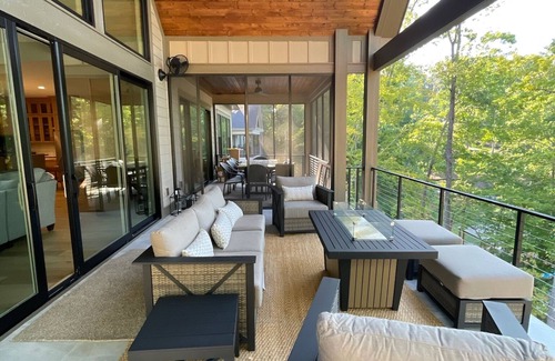 Stunning newly constructed home on Lake Keowee 25 minutes from Clemson is a perfect gathering spot for extended family and friends to enjoy a fabulous vacation. Floor to ceiling windows in the great room provide breathtaking views of the lake. Enjoy your morning coffee on the outside deck or cast a line off the huge covered dock, which is equipped with a swim seat and ladder for easy access to swimmers. Done swimming, explore the lake on our kayaks and SUPS. On those cooler days, take in fall colors on the outside patio while staying warm near the fire pit. Still cold, jump in the hot tub while enjoying the sunset over the lake.