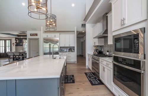 ✔ Gourmet kitchen with stainless-steel appliances, including a custom side-by-side refrigerator/freezer, 5-burner stovetop, dual ovens, and farmhouse sink
