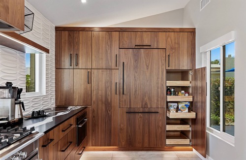 Harriet’s Hideaway is new, new, new! This Canyon Corridor (South Palm Springs) condo is luxuriously renovated with Fisher-Paykel appliances, innovative tech amenities, and sophisticated art and other furnishings in a modern fashion. This property is tucked into the base of the San Jacinto Mountains close to downtown restaurants, shops, and museums. This incomparable home-away-from-home is designed around pampering our Chihuahua, Harriet. She shares her Roche Bobois chair in the TV area for belly rubs. The soothing water feature at the front door welcomes guests. Several living areas throughout the home, provide diverse opportunities for quiet time or entertaining. One cannot ask for a better Palm Springs getaway or view of the mountains!