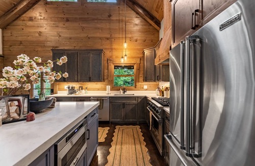 From the moment you arrive, you're surrounded by natural beauty—wildlife sightings, soaring hardwoods, and the tranquil sounds of the creek below. Inside, you’ll find a curated mix of modern furnishings, organic bedding, and a stunning chef’s kitchen, all designed to help you unwind in style.