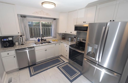 The fully stocked kitchen has everything you need—cookware, utensils, modern appliances, and extras like a coffee maker, toaster, and blender. Enjoy meals at the spacious indoor dining table seating up to eight guests or take it outdoors on the back patio for a relaxed setting.