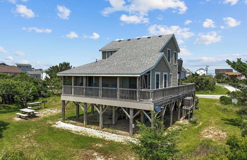 Head for the beach and settle into Migration. Enjoy views of the ocean, sound and the Bodie Island Lighthouse. Migration is the perfect place to escape to for a wonderful summer vacation. Enjoy the beach, bring the bikes for a ride or enjoy the many family amenities within the home such as foosball, darts or the PlayStation just to name a few. This charming home is located in South Nags Head and has been thoughtfully planned with your vacation in mind.
