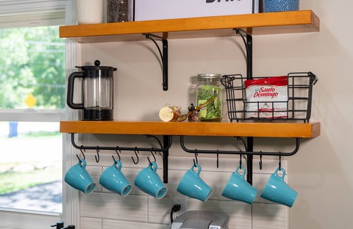 The living space displays the works of local artisans to complement contemporary decor with a hint of farmhouse style. Colors are serene and neutral, and comfort is the standard. Oversized windows flood the space with natural light. After hiking in one of the many parks or enjoying Lake Erie, retreat to the living room for a movie night. This comfy space includes a flatscreen TV with streaming access and Wi-Fi. For those who prefer quiet card games and a cup of tea, we have you covered as well!