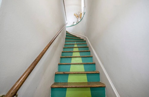 This apartment has all of the beautiful features of days gone by. Enjoy the quietness of our historical building. The spacious open studio provides you the comforts of your own home. A full upgraded glass sexy shower, queen size bed, shower, internet, compact washer/dryer and a full size kitchen will add convenience and luxury to your stay. Enjoy our antiques that we collect too!