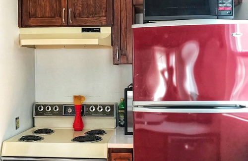 This condo has been recently updated and features two balconies, a small but full kitchen, washer and dryer, living room with TV you can connect your streaming accounts to (no cable) and a lovely spiral staircase leading to a lofted bedroom. There is a half bathroom downstairs at the entrance and a full bathroom upstairs.