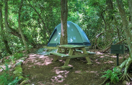 Enjoy the fresh, cooler mountain air in a beautiful, private setting! It is perfect for 2, but up to 3 additional guests is an available option! Heartstone is located on a gently terraced slope where a divided mountain stream, the tumbling Squally Creek rejoins itself! The sun light filters down through the forest canopy providing a warm, inviting glow!! " Like a fairytale", said one guest. There is a 9'-6" x 10' tent platform, a picnic table and charcoal grille, and comfort facility all within 30' of your private parking!