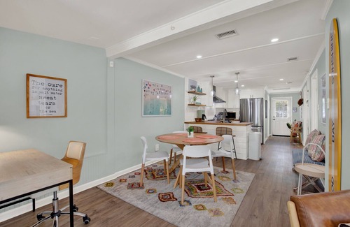 Step inside and feel instantly at ease. This bright and thoughtfully styled home features an open layout with large windows, allowing sunlight to stream through every corner. The cozy living room is the perfect place to unwind after a day at the beach. Curl up on the sofa for a movie, read a book, or enjoy a quiet night in. The sofa also transforms into a bed, which is ideal for accommodating additional guests or younger travelers.
