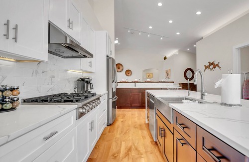 Kitchen: The fully stocked gourmet kitchen has two islands with stainless steel appliances including a six burner gourmet gas stovetop, built in oven / microwave, wine fridge, and plentiful counter space. There's an island with custom wood bar top with seating for four and a separate prep area with additional seating for four.
