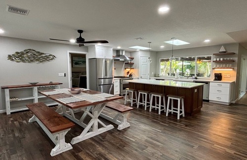 This home has been under renovations for two years- all the updates make this home the perfect home for vacation. The open kitchen with passthrough windows; over looking the gorgeous over sized pool- brings the inside outside. The living room has pocket sliders allowing full access to the covered patio with a bistro table for six people and lounging patio furniture around the pool. Make sure you slide through all the photos- this home offers more than words can describe. Walk a 1/2 block to the beach through the quiet neighborhood or 1 block to the river in the opposite direction- note this location offers you the ability to not miss any sunrise or sunset. The primary bedroom offers French doors to the pool and spacious bathroom. Second bedroom has a queen bed. Third bedroom has two twins and the fourth bedroom is a studio layout and it has a queen bed, living room and a kitchen. Making the fourth bedroom is perfect for multi-family vacations.