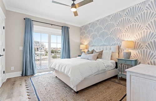 There are also two bedrooms on the upper level. The first includes a bunk room with four built-in bunk beds: one full-size bed and three extra-long twins. While this room is great for kids, the larger bunks make it an option for adults too! Each bunk has its own reading light, outlet and shelf to place personal belongings in place of a nightstand. And lastly, the master suite features vaulted ceilings with accented wood beams, a walk-in closet and 55” TV across from the inviting king bed. The master bath features his and her sinks and a large walk-in shower. The outdoor space with incredible views at all times of day (but especially at sunset!) features a 28x14 pool with loungers and Polywood chairs. A Life Saver Pool Fence designed for child safety can be installed for an additional fee and surrounds the pool area. There is also an oversized outdoor shower, the first stop to rinse off the sand after your WALK home from the beach. The 4-burner propane grill makes cooking outdoors a pleasure! Lastly, a storage unit is where you can find beach chairs, umbrella, beach toys and other fun things to enhance your stay!