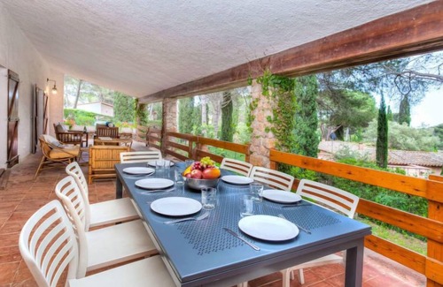 Sector Empuries: Large house "Hermine", surrounded by trees. Outside the resort, 1.9 km from the centre of L'Escala, in a quiet position, 500 m from the sea, 500 m from the beach. Private: garden 1'000 m2 (fenced) with wildlife garden and trees. Terrace (50 m2), garden furniture, barbecue. In the house: WiFi. Very bumpy motor access to the house. Stepped path (13 steps) to the house. Parking at the house, single garage. Supermarket 450 m, restaurant 900 m, internet café 2 km, bicycle rental 1.6 km, bus stop 1.1 km, railway station "Figueres" 30 km, sandy beach "Platja del Rec d'Empuries" 500 m, diving center 3.5 km, indoor swimming pool 1.1 km. Sports harbour 3.6 km, surf school 3.5 km, sailing school 3.5 km, tennis 1.1 km, riding stable 1.9 km, sports centre 1.1 km. Nearby attractions: Ruinas Greco-romanas d'Empuries 450 m, Skydive Empuriabrava 23 km, Aqua Brava Park Roses 27 km, Casino-Festival de Perelada 30 km, Museo Salvador Dali Figueres 26 km, Pitch and Putt Gualta - 18 hoyos 15 km.