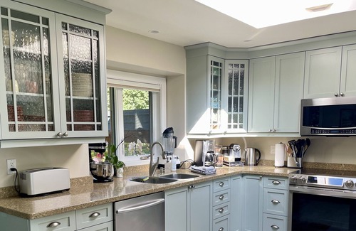 The kitchen is a cooking enthusiasts dream. It has granite counter tops, gorgeous cabinets, stainless-steel appliances which includes: a state-of-the-art induction range with duel convection oven, fridge and freezer with filtered water and ice maker, high-end, silent dishwasher, built-in, multi-function convection microwave, coffee machine, regular drip coffee machine, coffee grinder, Vitamix blender, high-end cookware, and so much more. There are loads of counter space for prep but be warned…. it is hard to focus because one area provides a beautiful view of the ocean and the other, the spectacular gardens and pond. The kitchen also provides a second eating area and has table for 6.