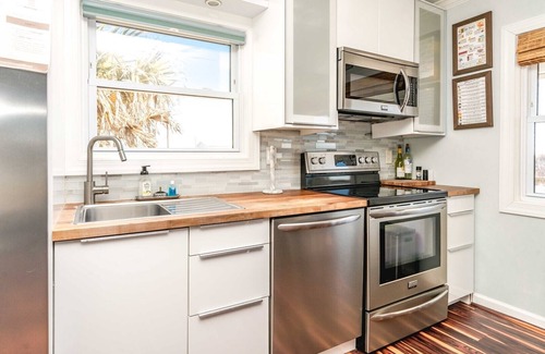 Welcome to the Hibiscus Hut! This charming home has a quaint, vintage feel with a 1950's tiki style vibe, complete with all the modern conveniences you'll need. Located on North Topsail Beach, this 2 bedroom, 1.5 bath home with panoramic ocean views is located in a quiet area on a strip of unspoiled sandy beach. The living room, dining area and kitchen are all in one open space making it the perfect spot to play a game, watch a movie or just relax and enjoy each other. Need a quiet spot in the house? The primary bedroom has a designated desk area in case you need to work while on vacation.