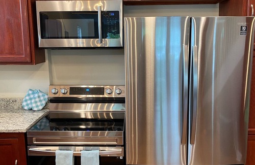 Each of the bedrooms have TVs with Fire Sticks so that you can enjoy Netflix, Amazon, Hulu, Pandora and more! There is a private full bath in the master bedroom and a half bath in a spacious guest room! The upstairs is peaceful and relaxing and has a nice sitting area for quiet time. There are also TVs in both the living room and the common space in the upstairs landing area. All appliances are state of the art and for those that love the kitchen, you will have everything you need to be GREAT!