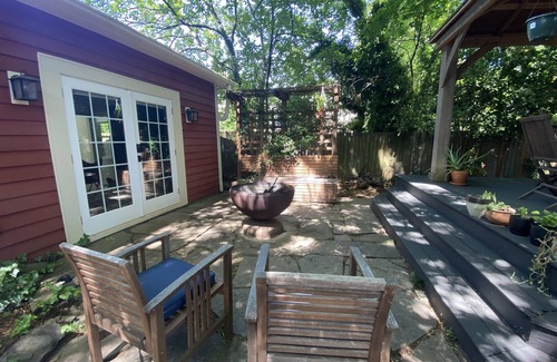 This guesthouse sits hidden in the middle of Plaza Midwood, complete with parking and even has an optional private entrance for guests. French doors open to the outdoor space, which has a fire pit, a dining area and is a perfect accompaniment to the guesthouse's floor plan.
