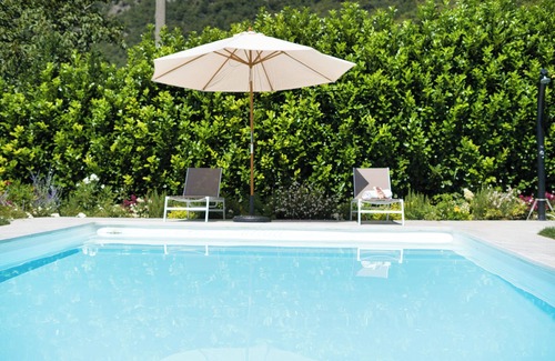 The pool, immersed in the garden largely shaded by a large beech tree, is equipped with a hot shower and a relaxation area with sun loungers.