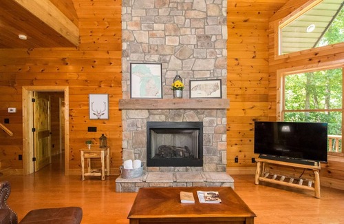 Rustic all wood, with 20 foot cathedral ceilings and a wall of glass in the main living area. The perfect place to come and relax, the closest house is a 1/2 mile away. Two levels of decks to enjoy the solitude, with a hot tub and fire pit on the lower level. Two bedrooms on the main level, One in the loft, and one on the lower level. Lower level has a massive family room for enjoying a movie or for the kids to run around and play.
