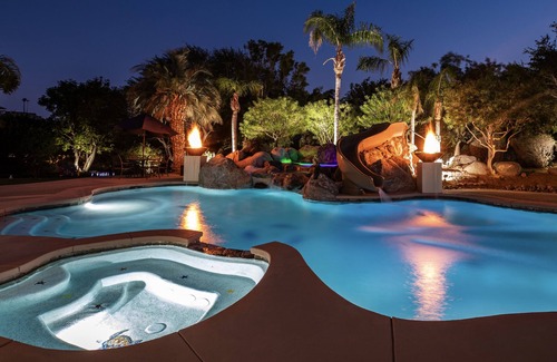 This villa's a star! And the excitement continues to grow! Recently, we've enhanced the property with an epic game room, a fantastic gym, a splashy waterslide, captivating water & fire features, and revamped the pool with Pebble Tec with sea creature motifs. With awesome water features and improvements throughout the house, your stay promises to be unforgettable! 220 EV charger available and accommodations for over 16 guests!