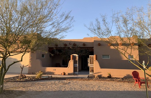 This classic Santa Fe house on 1+ acres has views from every room. Only 1 hour from Sky Harbor airport but adjacent to the state wilderness the scenery is truly breathtaking and like its street name, tranquil. Whether reading, stargazing or playing outdoors the urban dweller will relax and be refreshed.