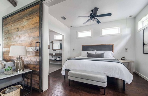 Unwind in a king-sized bed with luxury linens, modern décor, and abundant natural light. A Roku TV makes it easy to enjoy your favorite shows, and double doors provide direct access to your private courtyard.
