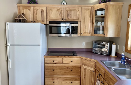 🌼 Beautiful hickory kitchen with nice accessories for you to use. Please note: We do not have a full size oven, but feel free to use the crock pot. This is nice to have in the fall/winter for your comfort food such as lasagna, a roast & potatoes etc. It is so wonderful to put your meal in and go and enjoy your day. We also have a toaster oven.