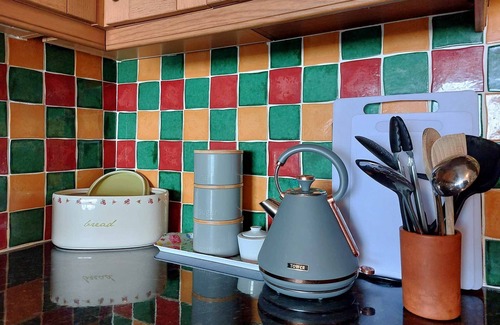 Separate by a breakfast bar with stools, the kitchen has numerous oak effect fitted units with granite look worktops. There is a ‘SMEG' electric oven/grill and a SMEG 5 rings gas, an undercounted fridge with a freezer box, a slimline dishwasher, toaster, microwave, kettle, washing machine, iron, airer, and ironing board. It is equipped with everything you would expect in a well-presented holiday home kitchen, inc pots, pans, glasses & all the crockery. There is a period dresser for storage, a drop-leaf table, and 4 chairs that can be put up in the kitchen area for dining.